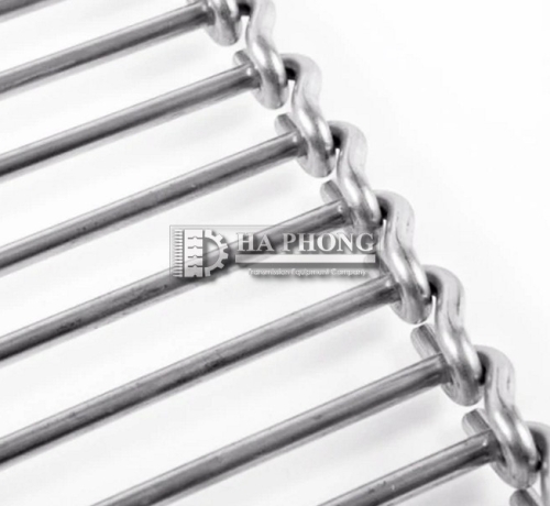 Băng tải lưới inox dạng thang 1 hàng có móc chữ S chạy trong các ứng dụng thẳng nhưng cũng có thể chạy cong với các góc bán kính bên trong cố định trong các ứng dụng hướng tâm (90 và 180 độ).
